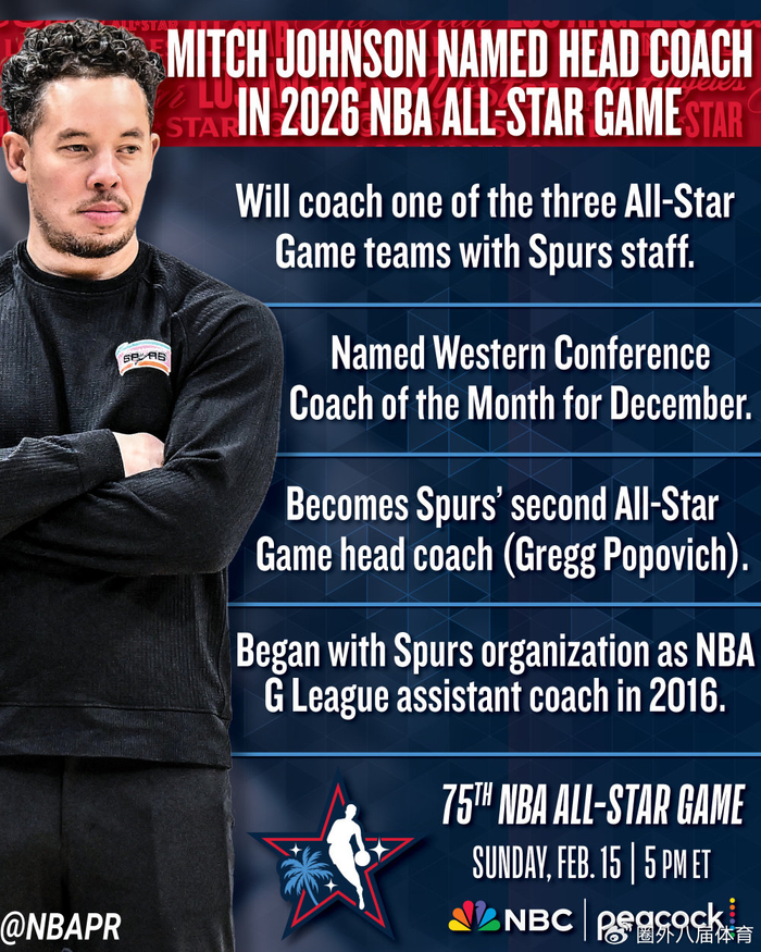 NBA官方宣布,马刺主教练米奇-约翰逊获得26年全明星周末执教资格,他将成为正赛美国队vs世界队的3支队伍的3名主教练之一。